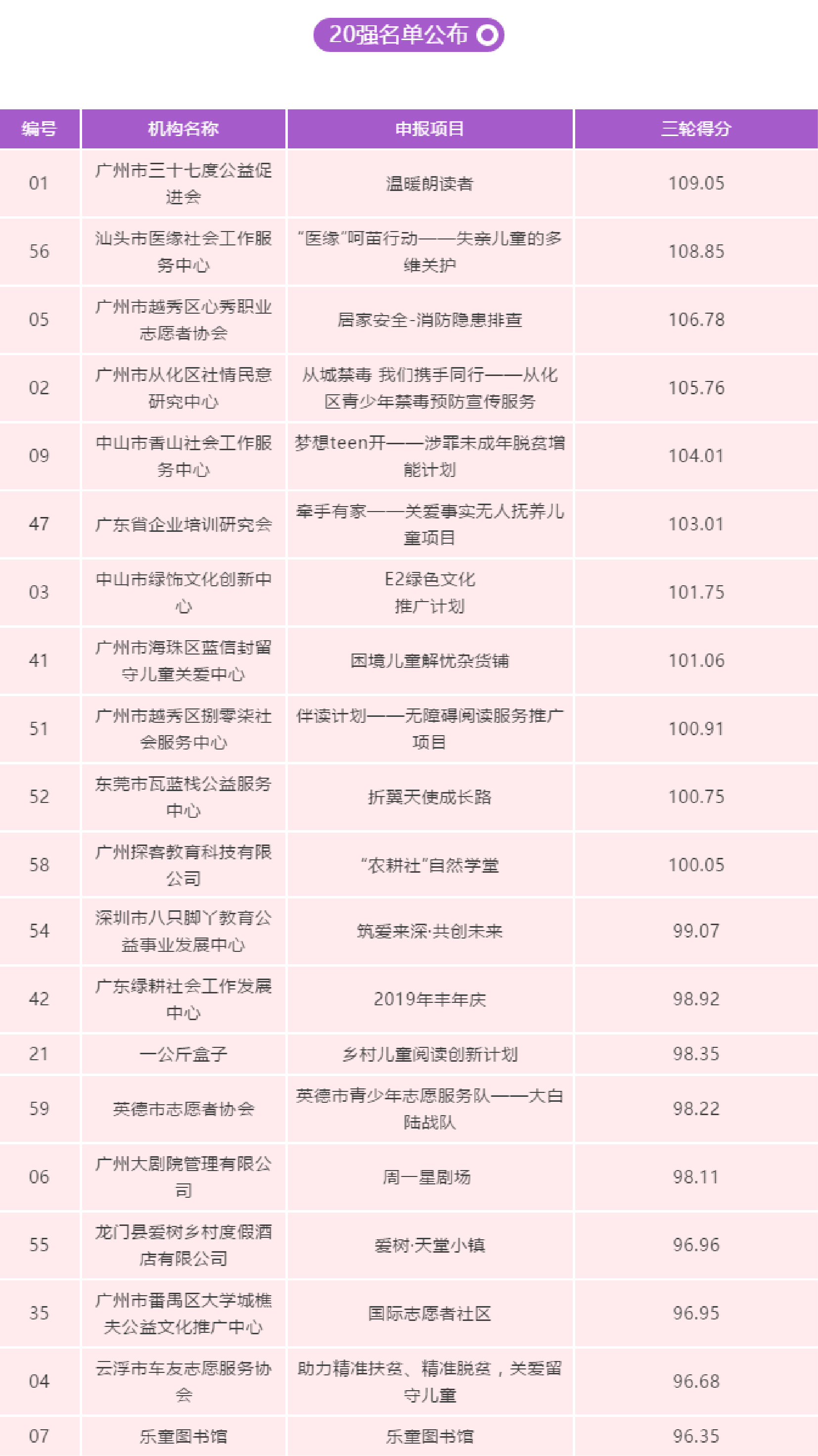 本次活动得到社会各界积极响应,共有80个公益创新项目报名参与,经过持续3个多月的初选,网络投票和可持续性报告打分三项评选,20强顺利诞生!