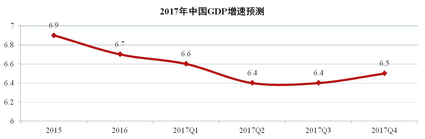 2017 年政府工作报告中称,基于国外复杂的经济形势以及国内推进供给侧改革的需要,2017年中国经济将继续维持平稳增长,全年GDP增长目标预期为6.5%,较2016年下降0.2个百分点。预计经济增长将呈现“前高后低”格局,经济减缓的幅度将逐步减小,并不断向潜在经济增速收敛。考虑去年4季度经济企稳回升(4季度6.8%,前三季度6.7%),今年以来经济活动继续保持较强增长势头。预计2017年国内经济形势将逐渐明朗,转折点或出现在第三季度。