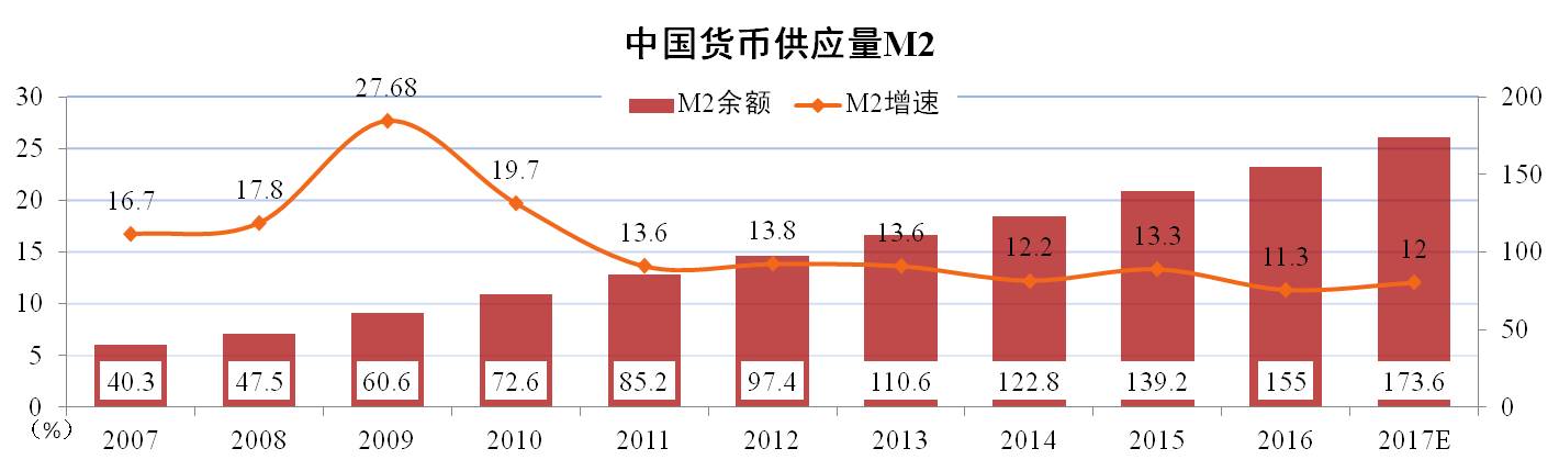 两会期间李克强总理在政府工作报告中指出, 2017年货币政策要保持稳健中性。因此,广义货币M2预期增长均为12%左右。在2016年政府工作报告提出广义货币M2预期增长在13%左右;但央行发布的2016年金融统计数据报告显示,2016年广义货币供应量(M2)余额155.0万亿元,仅比上年增长11.3%。
