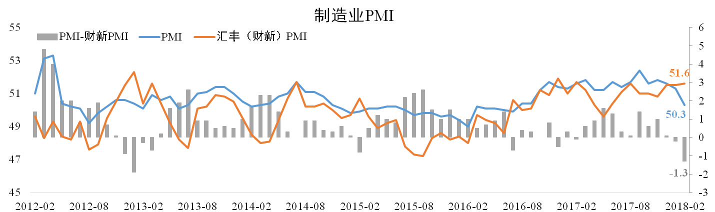 分析认为:官方制造业PMI虽仍处于景气区间但回落幅度明显大于季节性,反映了经济下行压力,可能与金融收紧有关。3月份春节、限产等短期扰动消退将导致PMI上行,但回暖幅度对2018年经济走向起到重要指示作用。