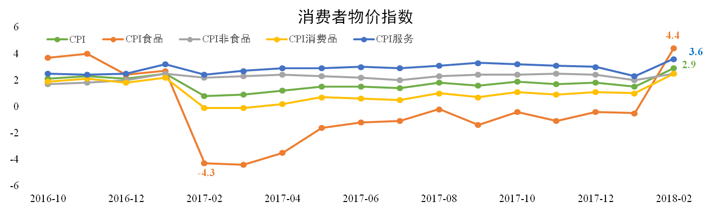 分析认为:去年同期食品项超低基数将导致2018年上半年CPI中枢明显高于去年,预计将在2.5%附近波动。政府全年通胀目标为3%,今年通胀整体将保持温和,央行全面加息概率较低。