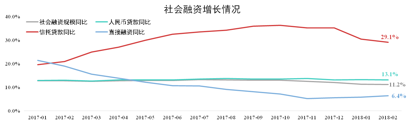 社会融资规模有所放缓。据人民银行数据,2月份社会总融资规模同比增长11.2%,与上月持平。合并1-2月数据剔除春节因素影响较去年多增5407亿元,表明实际信贷需求不弱。