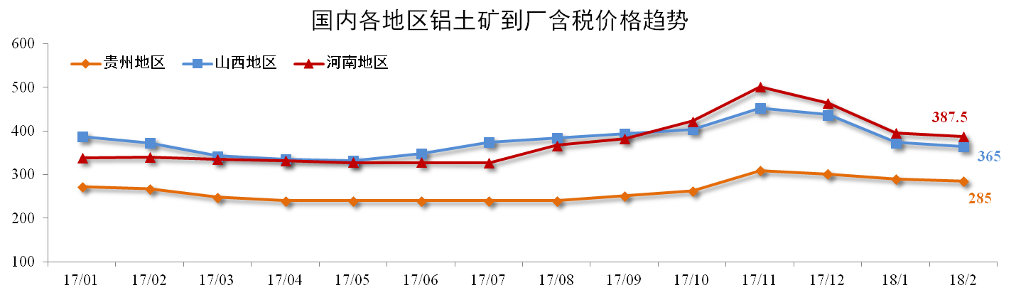 2月份各地铝土矿价格保持下调。截止2018年2月,贵州(AL:60%,A/S:5.5-6)到厂含税价月均价285元/吨,环比下降2.06%;山西铝土矿365元/吨,环比下降2.38%;河南铝土矿387.5元/吨,环比下降2.07%。