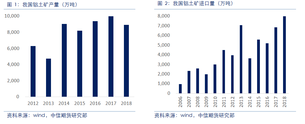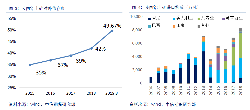 海关数据显示,2014年以来,我国铝土矿进口保持稳步增长。2018年,我国氧化铝产量约为7200万吨,铝土矿产量约1亿吨,2018年全国进口铝土矿约占国内矿石总供应量的42%。海外矿石因储量丰富、开采成本低、矿石品位较高等优势逐渐受到国内氧化铝企业的青睐,另外,随着山西地区资源过度开采,铝土矿品位下降,山西政府有保护省内资源的意愿,预计该地区矿石开采将继续受到限制,进口矿使用将逐渐成为主流。
