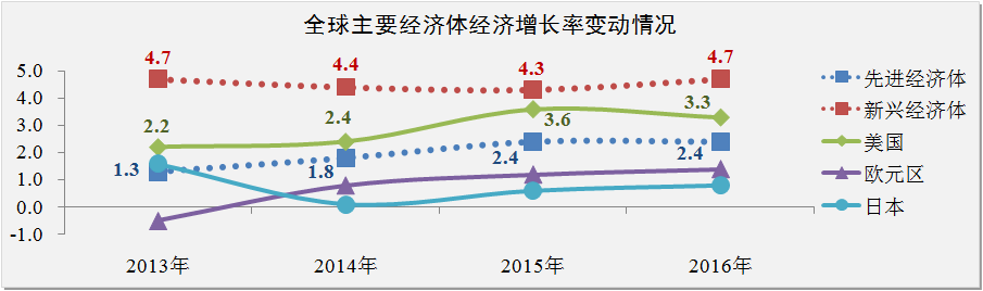 国际货币基金组织(IMF)在2015年全球经济发展展望预测报告中指出,目前全球经济呈现出四个趋势:一是石油价格自去年9月份以来下跌近55%;二是全球经济增长基本符合预期,但主要经济体增长情况存在显著差异;三是美元退出QE后币值上升近6%;四是新兴经济体的利率及风险利差逐步上升。IMF预计2015-2016年全球经济增长率分别为3.5%和3.7%。相比2014年10月期《世界经济展望》的预测,IMF对全球经济增长率下调了0.3个百分点。之所以做出这种调整,是因为对中国、俄罗斯、欧元区和日本经济前景做出了重新评估。应引起注意的是,美国是唯一增长预测上调的主要经济体。