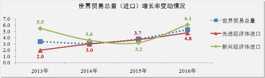 IMF数据显示,2015-2016年世界贸易总量(货物和服务)将会出现较快增长趋势,增长率分别为3.8%和5.3%。受石油价格及大宗商品价格下跌对贸易条件和实际收入的负面影响,预计2015年新兴经济体对世界贸易增长的贡献将低于先进经济体,增长率为3.2%。随着负面影响逐步化解,预计2016年新兴经济体的贸易增长率将快速回升至6.1%。