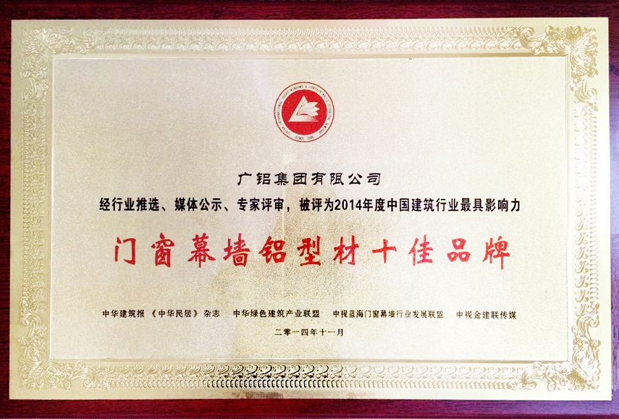 历时三个多月,2014年度中国建筑行业最具影响力“门窗幕墙铝型材十佳品牌”评选名单终于在11月份火热出炉。和记娱乐集团凭借雄厚的综合实力和市场影响力获此殊荣。