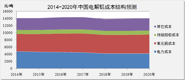 加权成本结构。2014年我国氧化铝生产成本主要由氧化铝、电力及预焙阳极三个方面构成。其中,氧化铝成本为4846.4元/吨,占比34.4%;电力成本为4809元/吨,占比34.1%;预焙阳极成本为1169.6元/吨,占比8.3%。研究预测,2015-2020年期间氧化铝成本占比将逐步提升至37.7%,电力成本占比将逐步下降至29.9%,预焙阳极成本占比稳定。