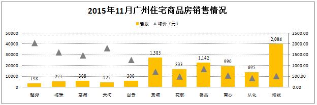 网签数据显示,11月份广州地区住宅商品房共销售8353套,环比上升1.2%,其中增城区销售套数位居榜首;全市均价为15657元/平方,环比上升11.6%,其中增城区销售均价为10608元/平方,略高于花都及从化均价。11月份住宅商品房量价齐涨的主要原因是政策效果显现,购房需求逐渐增强。