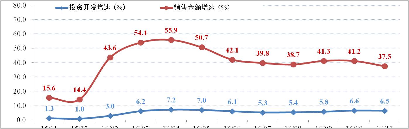 开发投资方面:2016年1-11月份,全国房地产开发投资同比增长6.5%,增速环比回落0.1个百分点。其中,住宅投资同比增长6.0%,增速提高0.1个百分点。住宅投资占房地产开发投资的比重为67.0%,与上月持平。