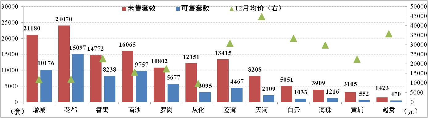 12月份广州市新建住宅商品房共196,038套,环比增加3.6%。其中可售和未售房源分别为61,887套和134,151套,其中花都、增城、南沙以及番禺四区,合计占比分别为69.9%和56.7%;而增城占比分别为16.4%和15.8%,均出现小幅下降。