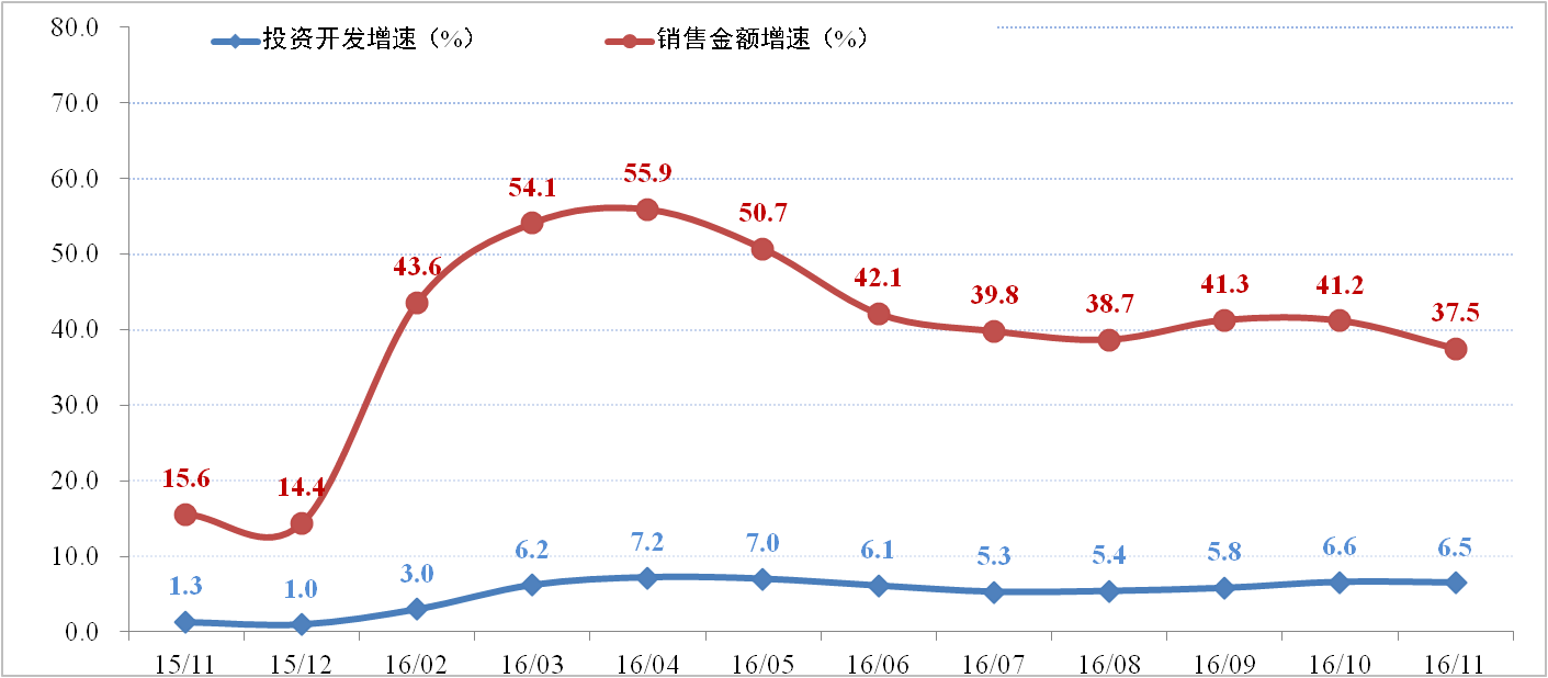 开发投资方面:2016年1-12月份,全国房地产开发投资同比增长6.9%,增速环比增加0.4百分点。其中,住宅投资增长6.4%,增速环比提高0.4个百分点。住宅投资占房地产开发投资的比重为67.0%。