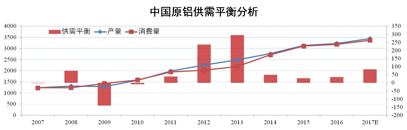 国内原铝供需方面:2017年,预计新增需求量在150万吨左右,总需求量在3367万吨左右;新增供给量在195万吨左右,总供给量在3450万吨左右,整体来看,2017年国内原铝供需方面在过剩约80万吨。
