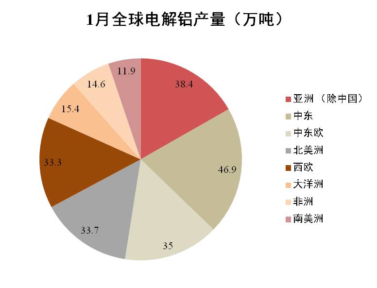 数据显示,1月全球(除中国)原铝产量环比微增0.1%至229.2万吨。当月日产量由12月的7.383万吨增至7.393万吨。预计2月份全球产量因生产天数减少出现下滑,但受印度新增产能和大洋洲复产的拉动,日产量将继续增长。