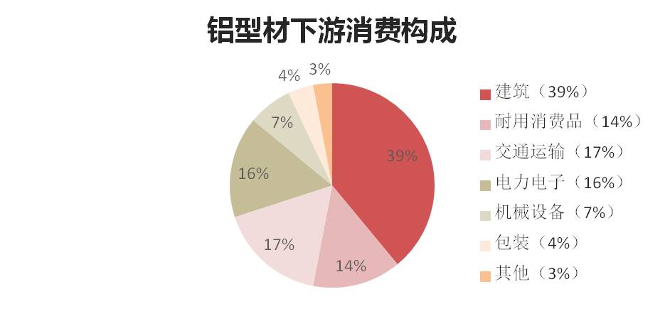2017年铝材的下游消费持有相对乐观的预估,这主要还是基于对宏观经济整体终端需求的偏强判断。在铝材的下游消费构成中,主要在为建筑和交通、电力用铝。其中,建筑(39%)、交通运输(17%)、电力电子(16%)、包装(4%)、耐用消费品(14%)、机械设备(7%)及其他(3%)。