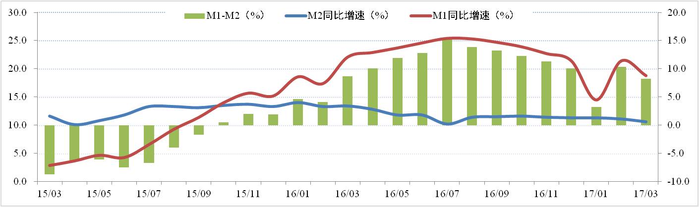 2017年2月广义货币(M2)余额159.96万亿元,同比增长10.6%,增速分别比上月末和去年同期低0.5个和2.8个百分点;狭义货币(M1)余额48.88万亿元,同比增长18.8%,增速分别比上月末和去年同期高2.6个和3.3个百分点。