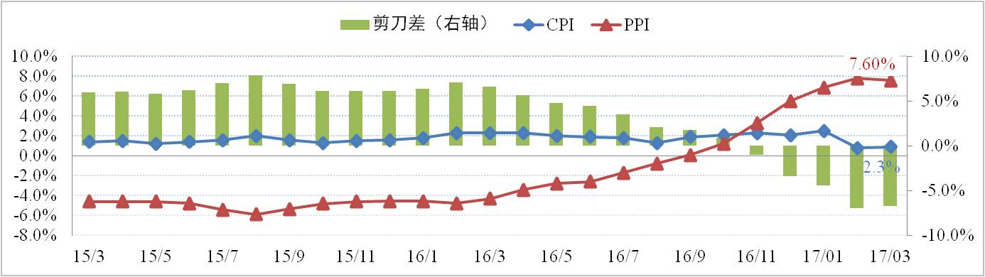 一季度国内经济呈现投资回升、贸易趋势性向好,PMI、CPI、PPI等主要经济指标数据均呈现向好局面,因此预计一季度GDP增长6.8%。但国内经济仍然呈现出工业生产稳以及消费数据弱的格局,主要表现在价格层面上PPI与CPI的剪刀差仍高,3月份CPI同比上涨0.9%连续两个月同比增长低于1%;PPI同比上涨7.6%,环比回落0.2个百分点涨幅依然处于高位。国内经济增长面临的风险主要来自金融和房地产风险两个方面;其中,主要包括债务违约和债务处置负担沉重、房地产投资和民间投资增速下滑、去杠杆、去产能和隐性失业问题等风险。