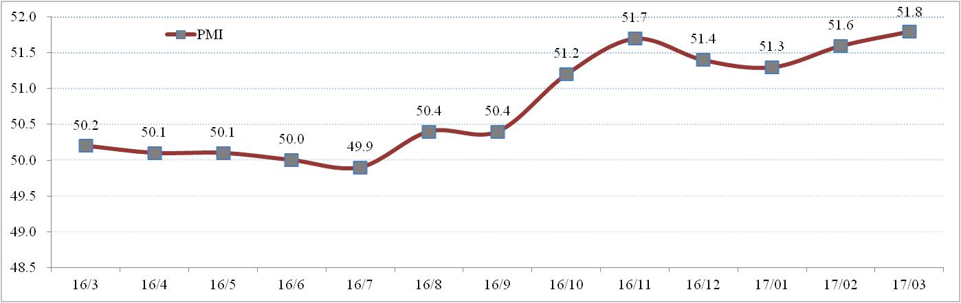 国家统计局数据显示,2017年3月份制造业采购经理指数PMI为51.8%,连续两月上升。其中,生产指数和新订单指数为54.2%和53.3%,分别比上月上升0.5和0.3个百分点。在生产和需求增速回暖的同时企业采购力度加大,采购量指数为53.4%,高于上月2.0个百分点。