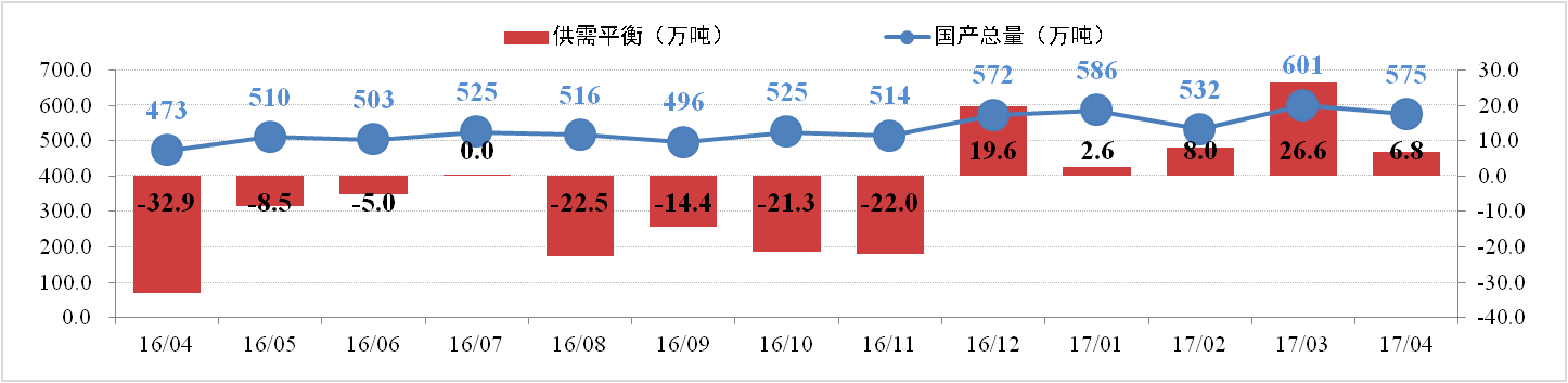 据行业统计数据,目前全国氧化铝总产能为7723万吨,开工产能7071万吨,开工率91.56%。4月份氧化铝产量约575万吨,同比增加17.2%。减复产方面,中铝河南80万吨置换产能逐步投产;中铝山西、中铝中州、中铝遵义分别减产80万吨、25万吨和30万吨产能;三门峡义翔60万吨产能减产检修。4月份国内氧化铝供给存在约6.8万吨的过剩。