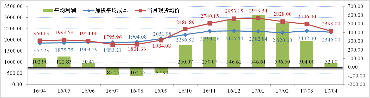 援引行业数据显示:2017年4月中国国产氧化铝按运行产能加权平均成本2346元/吨,较3月份下跌约54元/吨。其中,煤炭和矿石价格小幅下滑、烧碱价格受环保因素影响相对坚挺。以4 月末的大单成交平均价格 2300 元来计算,多数氧化铝企业已经开始进入盈亏平衡甚至微亏状态。