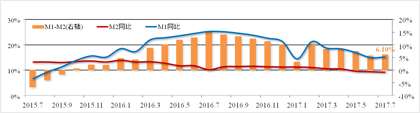 7月份M2增速为9.2%,较上月下滑0.2个百分点,再创历史新低。M1与M2 差额为6.1%,较上月扩大0.5个百分点。社会融资规模累计168.01万亿元,其中 实体经济融资规模114.31万亿元,同比增长13.5%,较上月扩大0.4个百分点。