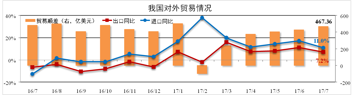 据海关总署数据,7月份我国进出口总值3405.55亿美元,同比增长8.8%。 其中出口1936.46亿美元,同比增长7.2%;进口1469.09亿美元,同比增长11.0%; 贸易顺差为467.36亿美元,环比上涨9.3%。
