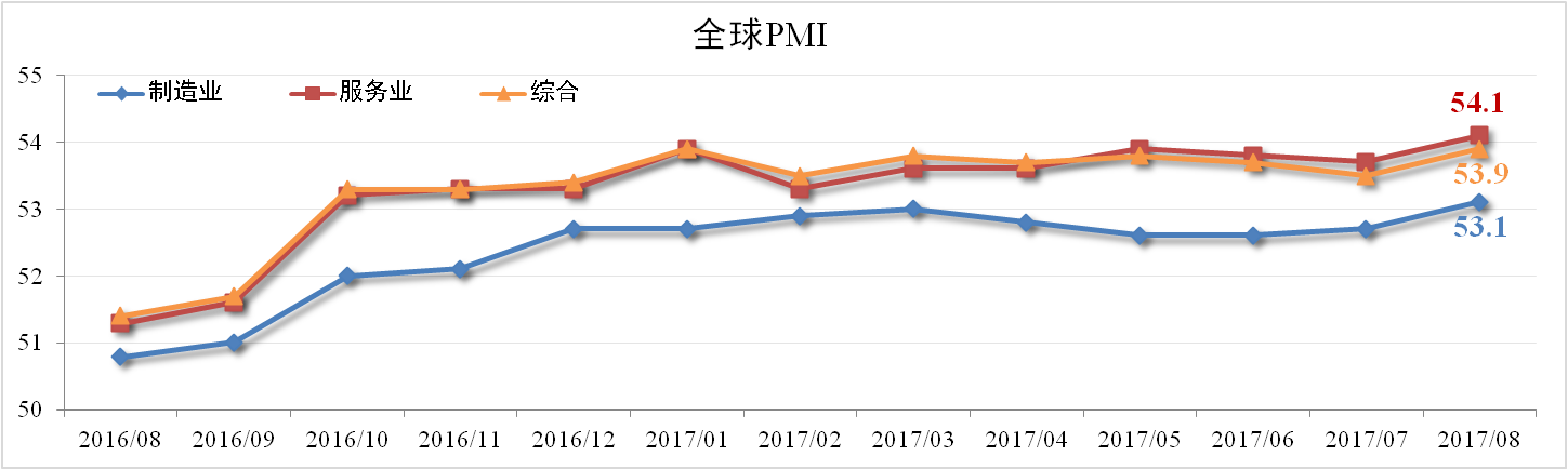 据HIS Markit与摩根大通发布的数据显示,8月份全球综合PMI为53.9,较7月扩大0.4个百分点,达2014年2月以来高点。其中服务业PMI为54.1,制造业PMI为53.1,均较上月扩大0.4个百分点。