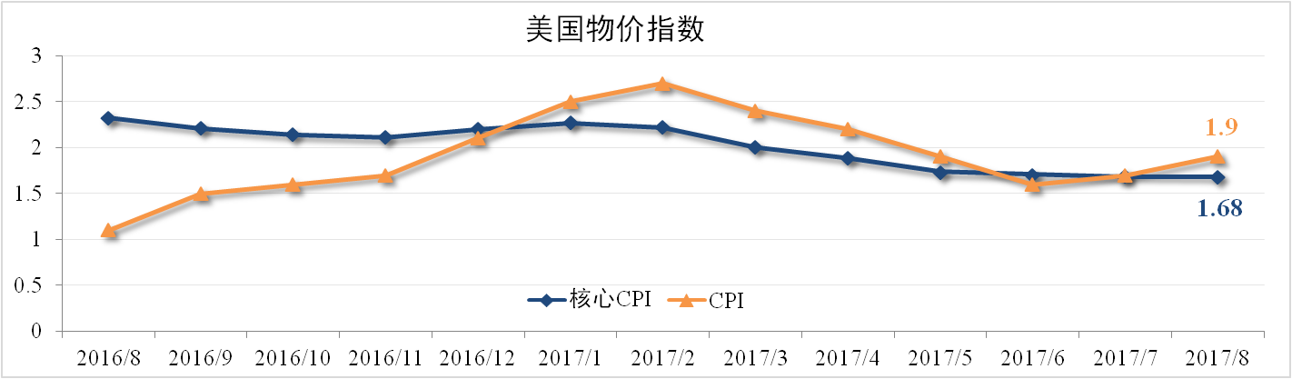 8月美国CPI为1.9%,核心CPI1.68%,双双超出市场预期。受飓风哈维影响,墨西哥湾地区炼油厂被迫停产,飓风沿线地区600多万人口迁移,带动沿途汽油价格与房屋租金上涨,成为此次支撑CPI上涨的主要原因。