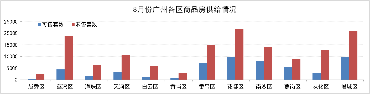 8月31日,广州市新建住宅商品房共194,949套,环比上升3.1%,其中:可售住宅商品房为54,104套,占比27.75%;未售住宅商品房140,845套,占比72.25%。花都、增城、番禺、南沙库存量较高,可售和未售房源累计占全市比例分别为63.73%和51.13% 。
