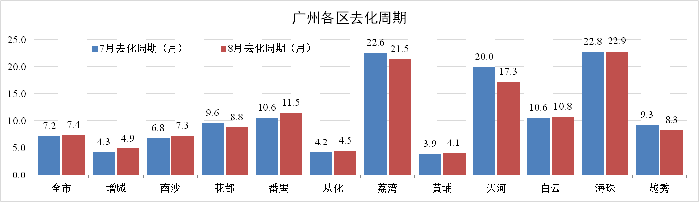 8月份广州住宅地产去化率达86.6%,去化周期环比增加0.2个月为7.4个月。其中,增城、南海、番禺三区去化周期有所上升。但由于外围地区刚需强劲,增城、从化、黄埔等保持低去化周期,增城去化周期仅为4.3个月。