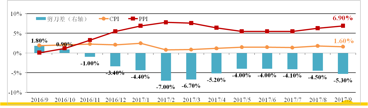 9月份我国CPI为1.6%,较上月缩小0.2个百分点,略低于市场预期,蔬菜 价格增速大幅放缓是主要原因,而核心CPI从2.2%升至2.3%,显示价格正向下 游传导。 受9月上半月黑色、有色大涨影响,PPI为6.9%,大超市场预期。