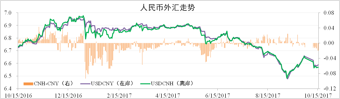 由于美联储缩表以及长假居民购汇需求增加等原因,人民币贬值。但美 朝局势动荡,加之美国通胀疲软,美元转弱。截至10月15日,在岸人民币汇 率为6.5884,环比贬值0.59%,离岸人民币为6.5689,环比贬值0.37%。