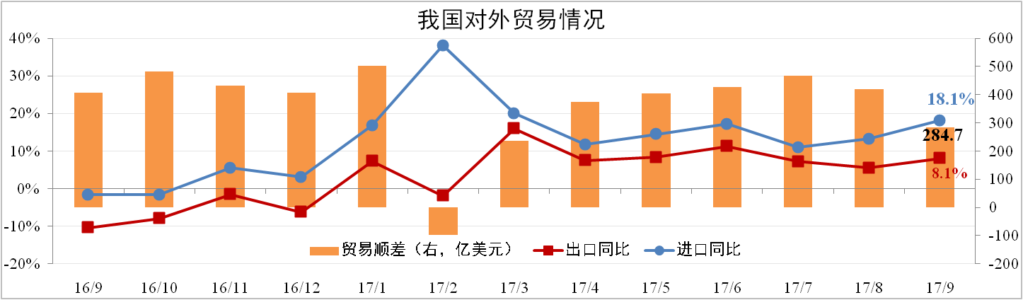 分析认为:9月进口大幅上升一方面反映国内需求韧性较强,下滑不显著,另一方面环保造成生产受限,需要更多的进口来弥补国内生产的不足。对美顺差扩大或对特朗普11月访华提供谈判筹码,对出口造成不利影响。