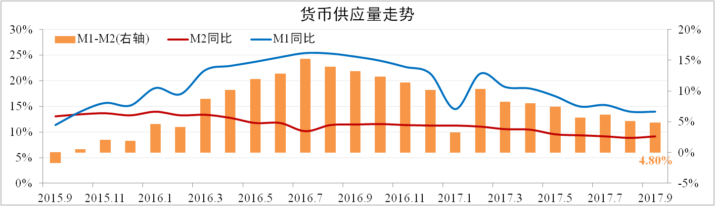 分析认为:受上游盈利转好以及产能扩张受限影响,企业部门融资需求有走弱趋势。另外“金九”惨淡收场,房产调控趋严,旺季不旺。综合来看,M2回升动能不强。预计10月货币供应依然偏弱。