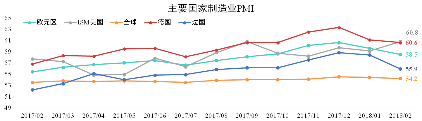 全球经济景气程度有所放缓,且发达国家之间出现分化。2月份全球制造业PMI为54.2,较上月下滑0.2点。欧洲国家PMI普遍下滑,但仍处于扩张区间,美国ISM制造业PMI为60.8,较上月大幅扩大2.4点。