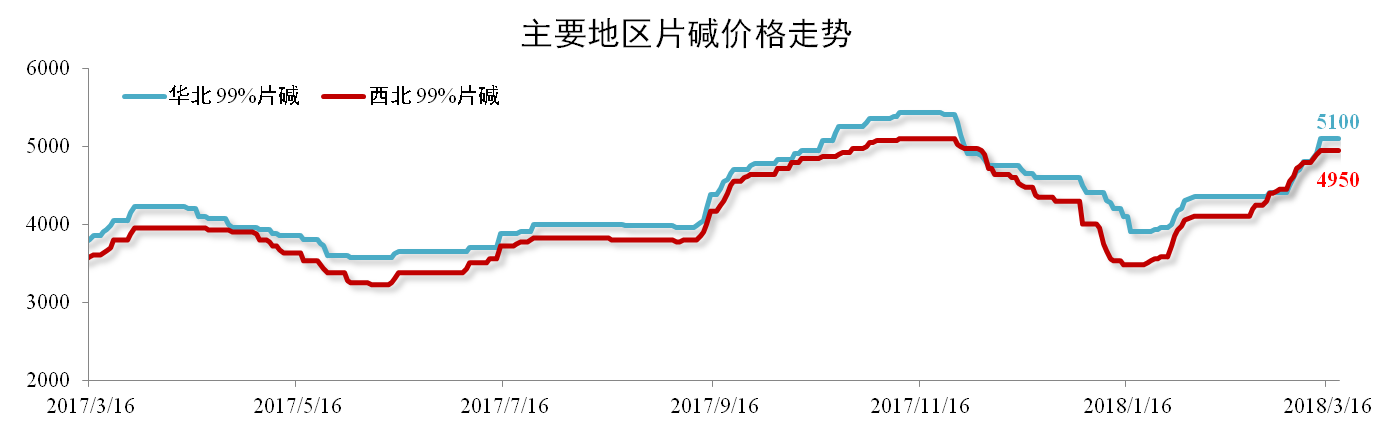 临近采暖季限产复工时点,下游企业备货需求旺盛,2月下旬至今片碱价格大幅上涨。截止2018年3月19日,华北99%片碱价格报5100元/吨,环比上涨17.24%,西北99%片碱价格报4950元/吨,环比上涨20.73%。