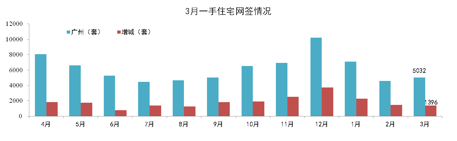 3月,广州一手住宅网签量成交4,570套,环比下跌35.76%。其中增城市场3月一手住宅网签成交1,396套,环比下跌3.8%。