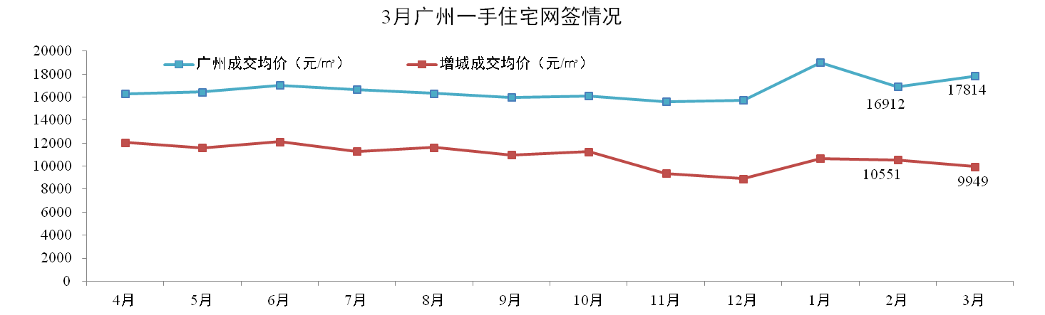 网签价方面:3月份广州一手住宅成交均价17,814元/m2,环比上升5.33%。其中,增城成交均价9,949元/m2,环比下降5.71%。