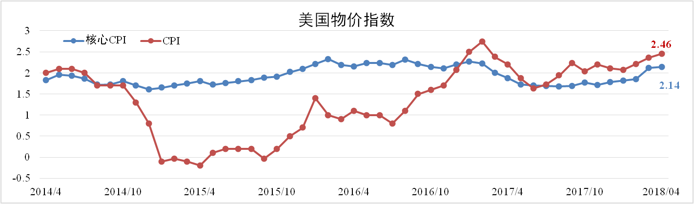 4月份美国CPI为2.46%,较上月扩大0.1个百分点,核心CPI为2.12%,较上月扩大0.02个百分点。通胀虽不及预期,但均高于3月。