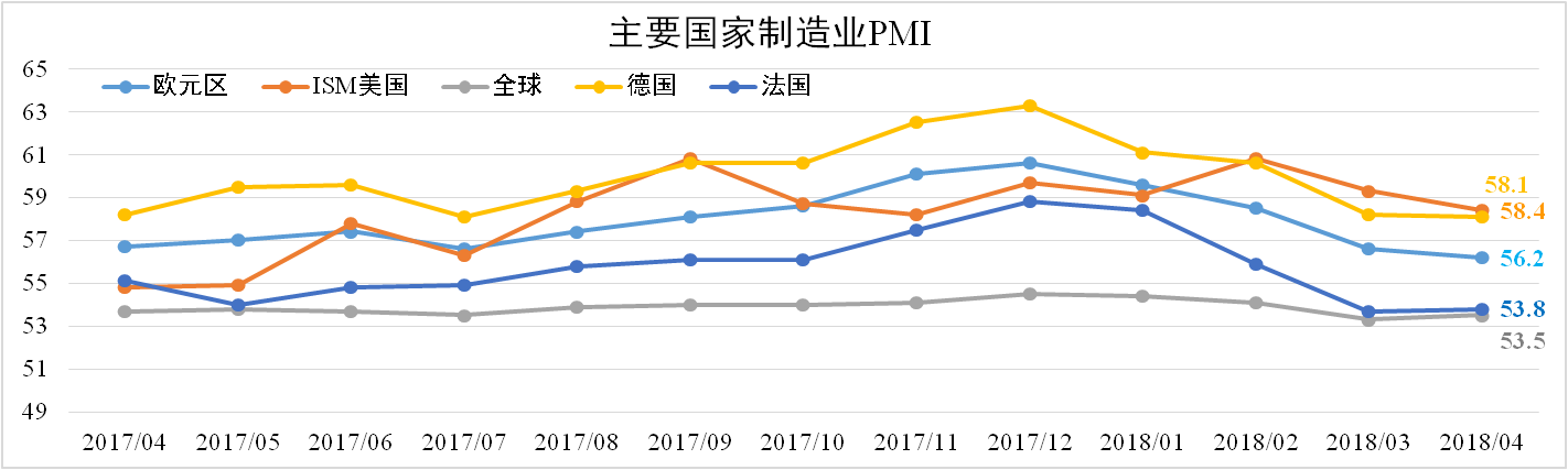 全球经济景气度有所回升。据IHS与摩根数据显示,4月份全球制造业PMI为53.5,较上月扩大0.2个百分点。其中,4月份ISM美国制造业PMI为57.3,较上月大幅收缩0.9个百分点,德国下滑0.1个百分点至58.1,整体平稳。