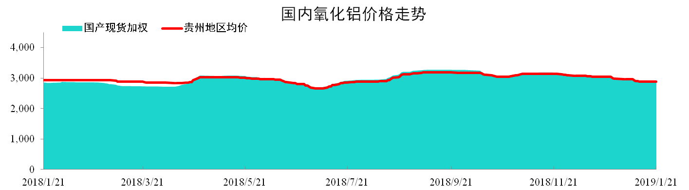 截至1月21日,国产氧化铝现货加权均价为2871元/吨,同比上涨0.56%,环比下降4.92%。贵州地区氧化铝现货加权均价为2882元/吨,同比下降2.36%,环比下降5.51%。