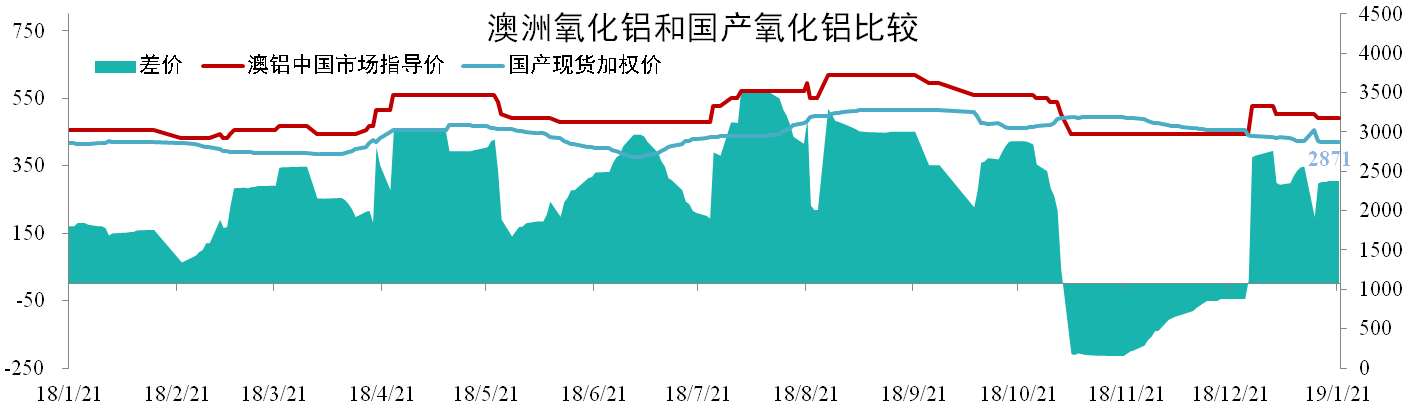 截至1月21日,国产氧化铝现货加权均价为2871元/吨,环比下降4.92%。澳铝中国市场指导价为3175元/吨,同比上涨4.96%,国产氧化铝价格较澳铝指导价低304元/吨。