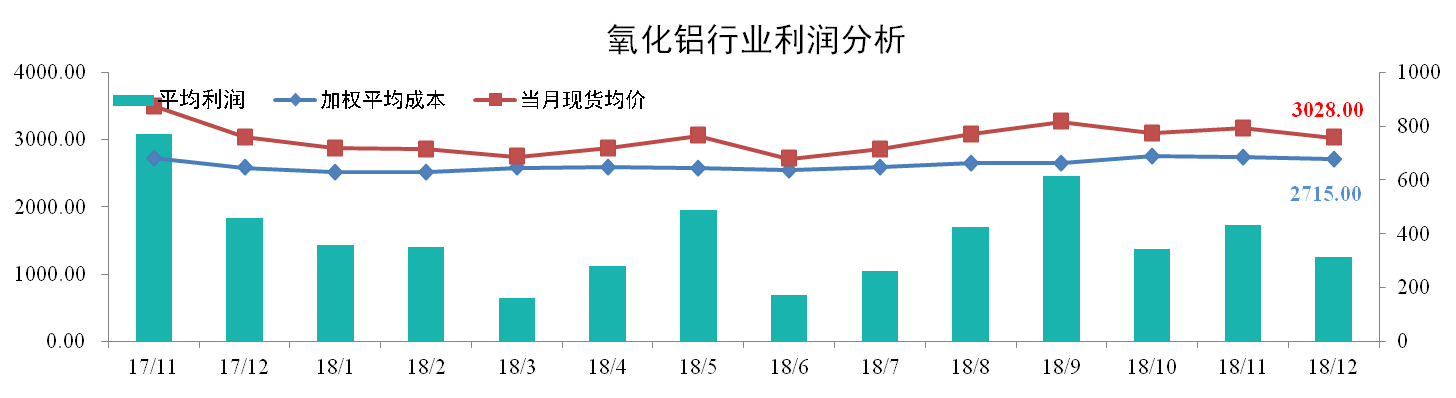 12月份国内氧化铝加权平均成本为2715元/吨,较上月下降0.80%。当月全国氧化铝现货成交均价为3028元/吨,较上月下降4.51%。理论氧化铝行业平均利润水平为313元/吨。