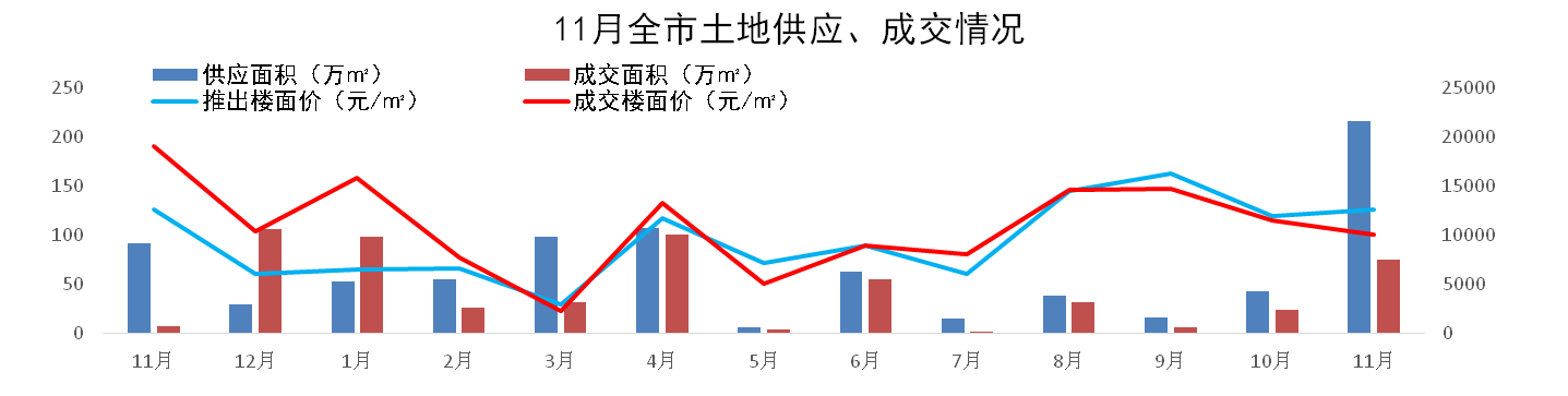 11月广州市共推出26宗地块,分别为25块住宅用地和1块商业用地,推出面积216.4万㎡。商住用地共成交12宗,成交面积74.7万㎡,成交楼面价10045元/㎡。