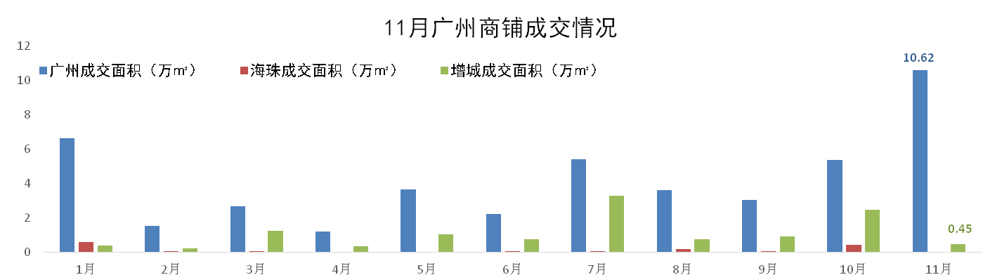 11月广州一手商铺成交10.62万㎡,环比增加54%。按区域划分,增城区一手商铺成交0.45万m²,环比减少81%,占全市成交量不足一成。按商铺类型划分,社区商铺成交占比8成。
